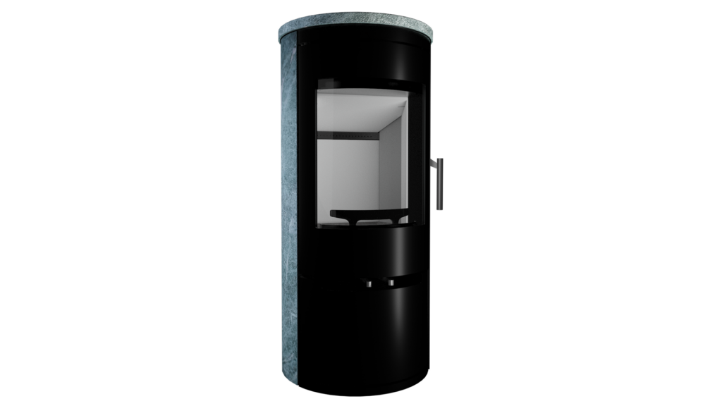 Poêle à bois en revêtement acier et pierre ollaire. Sa forme cylindrique et sa large vitre vous octroie une belle vision de la flamme. L’intérieur en béton réfractaire, ainsi que son corps de chauffe sont respectivement garantis deux et cinq ans.